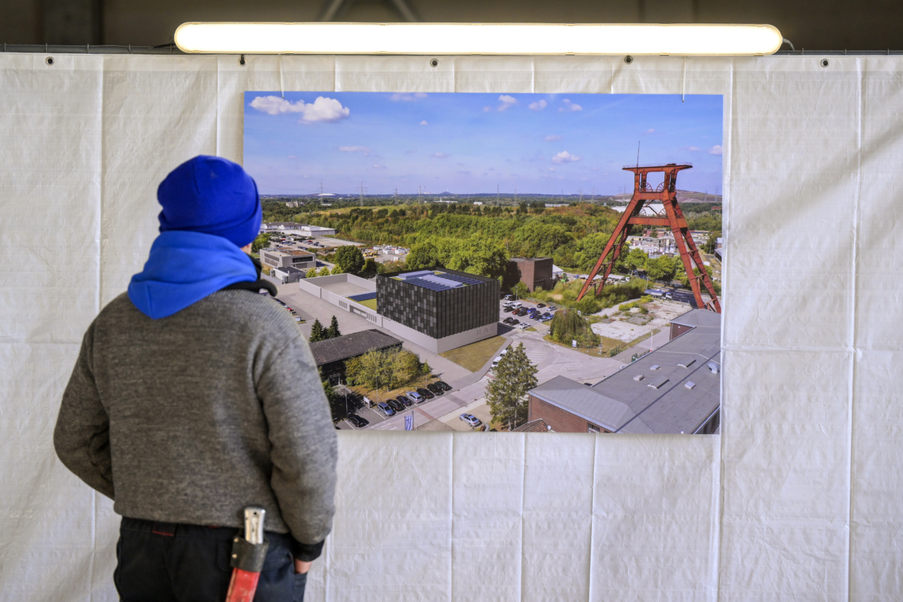 Nach Fertigstellung werden in der Halle große Pumpen gelagert, getestet und gewartet. Diese dienen zur Wasserrückhaltung in den Kohleschächten der ehemaligen Zeche Pluto. PV-Module werden großflächig an der Fassade angebracht und geben dem Projekt ein einzigartiges Erscheinungsbild, das den Eindruck eines großen facettierten Kohlestücks erweckt.