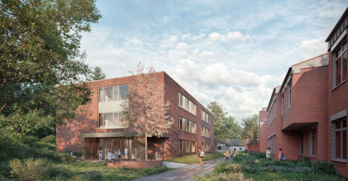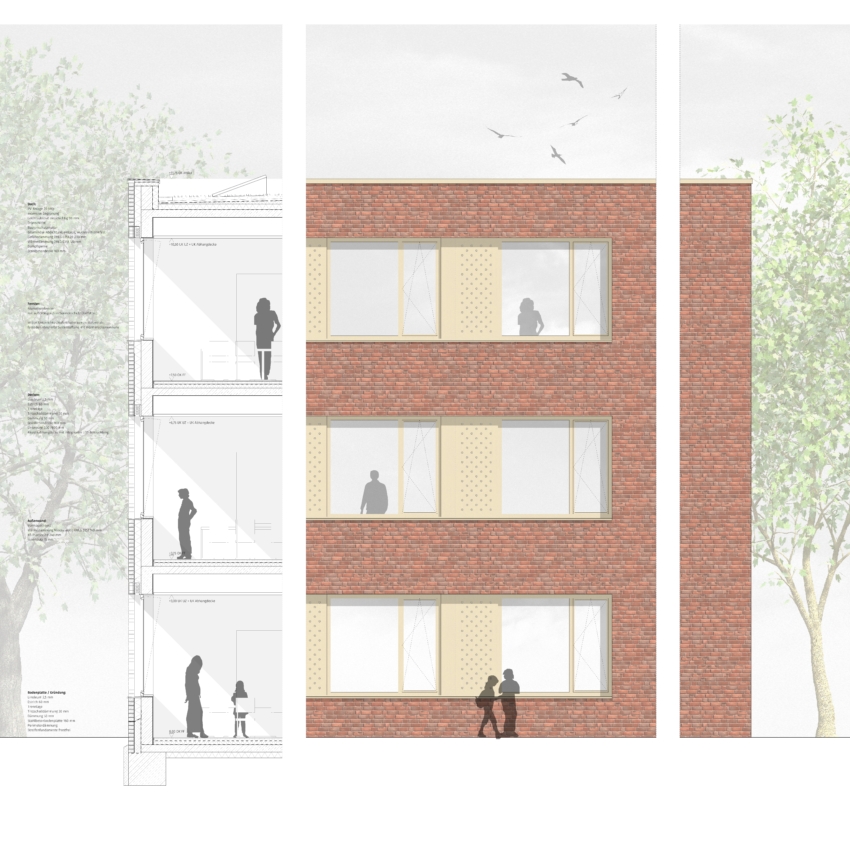 Die Architektur fügt sich mit ruhiger Gestaltung und roter Ziegelfassade selbstverständlich in das heterogene Schulumfeld ein und nimmt Bezug auf den Bestand. Fensterbänder mit messingfarbenen Profilen gliedern die Fassade, während dezentrale Lüftungseinheiten mit Wärmerückgewinnung für ein angenehmes Raumklima sorgen.