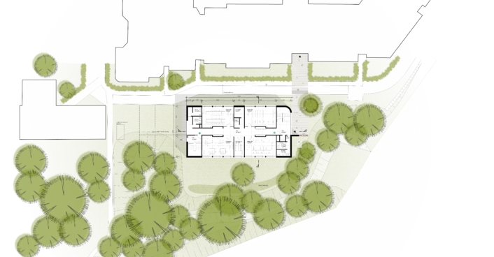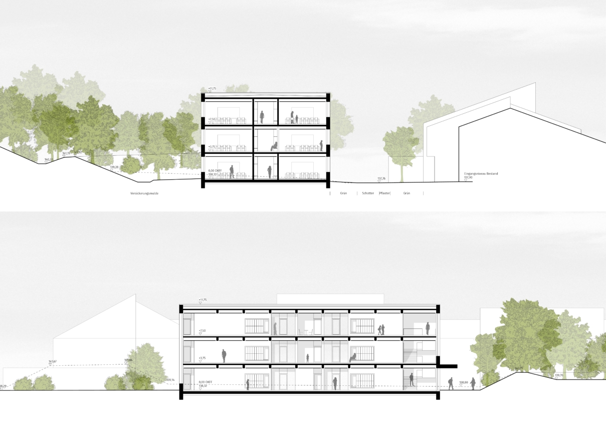 Das Flachdach ist extensiv begrünt und mit einer 20 kWp-Photovoltaikanlage ausgestattet – erweiterbar für zukünftigen Bedarf. Die Wärmeversorgung erfolgt über eine Wärmepumpe mit außenliegender Einheit. Die bestehende Feuerwehrumfahrt bleibt erhalten und wird für das neue Gebäude genutzt.