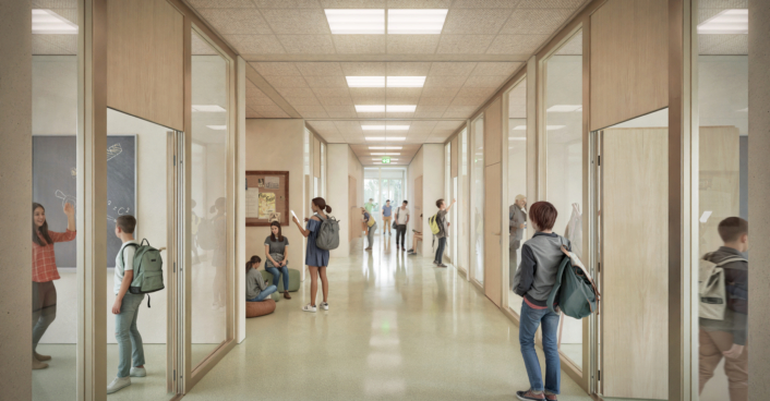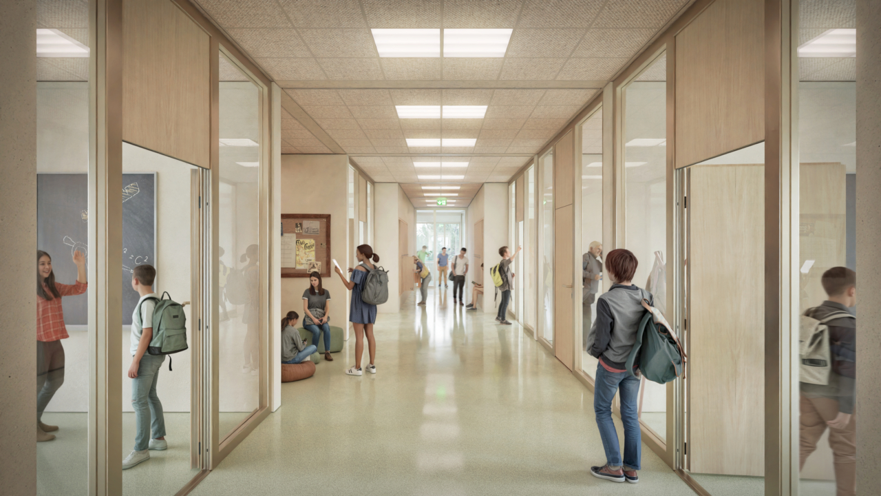 Im Inneren ist der Bau klar gegliedert: Drei identische Jahrgangscluster erstrecken sich über die Ebenen. Jedes Cluster verfügt über Unterrichts- und Differenzierungsräume, die flexibel zu einer gemeinsamen Lernzone verbunden werden können. Fluraufweitungen, Sitznischen, Spinde und großzügige Verglasungen schaffen Aufenthaltsqualität und Übersicht.